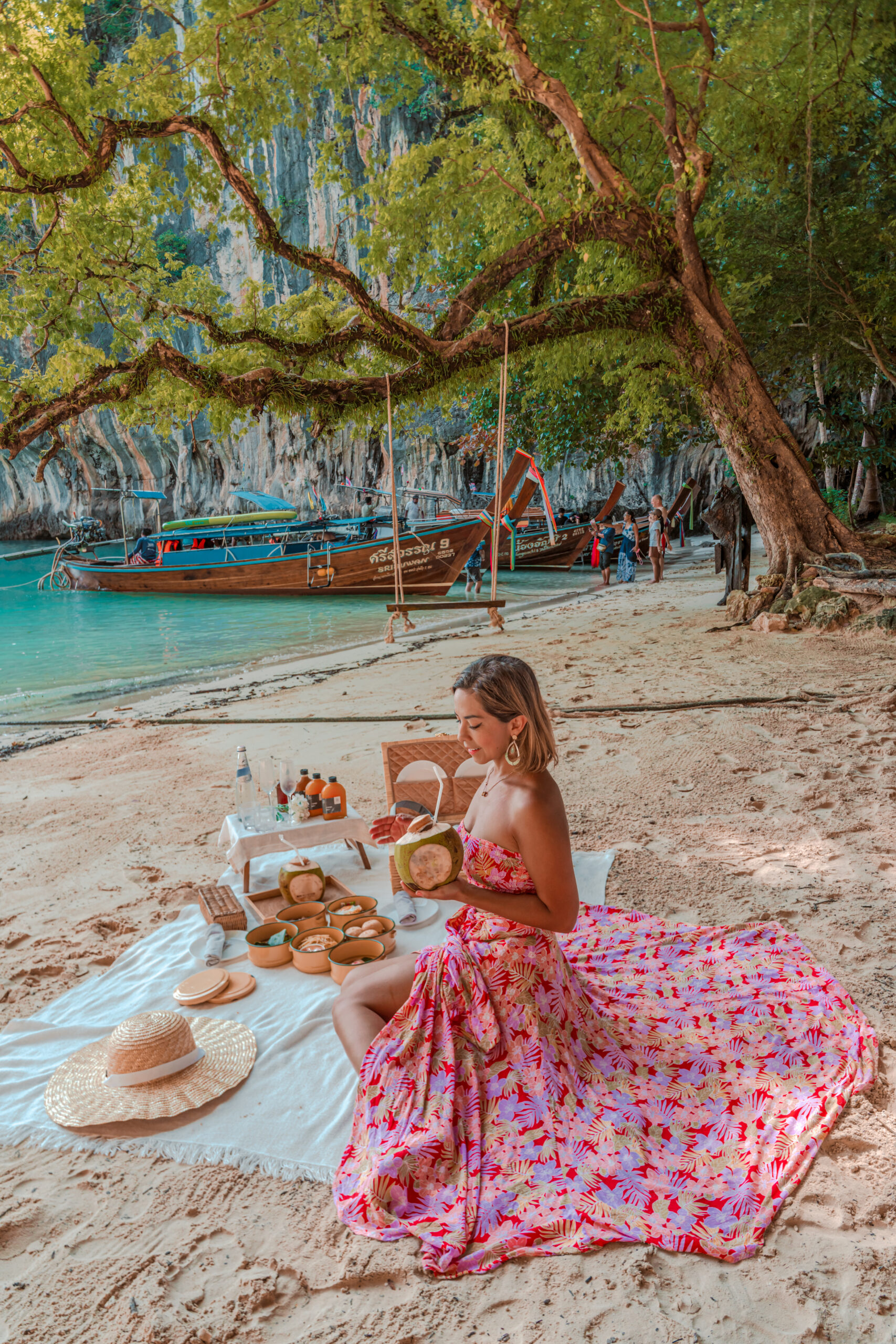 Lao Lading Island is a picturesque paradise located near Krabi, renowned for its stunning white-sand beaches, crystal-clear waters, and dramatic limestone cliffs. It’s perfect for swimming, snorkeling, and relaxing in a serene, uncrowded setting. The island’s tranquil beauty and unique landscape make it an ideal spot for nature lovers and adventure seekers looking to explore the natural wonders of the Andaman Sea. Enjoy a delightful picnic lunch setup on the beach, featuring delicious food in a serene, picturesque coastal setting.